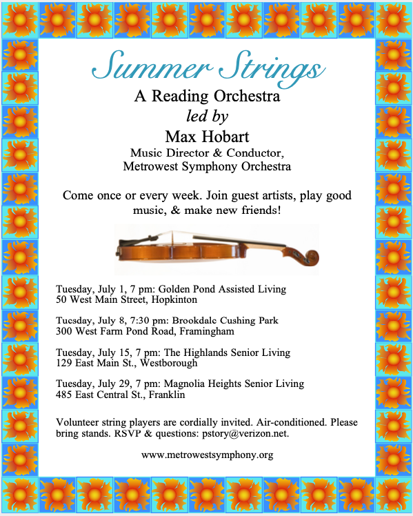 The final Summer Strings event will take place July 29 at Magnolia Heights Senior Living, 485 East Central St., Franklin, MA. 7:00 p.m. Our special guest soloist will be violinist Victor Romanul, freshly retired from a long career with the Boston Symphony. Free and open to all. Please join us!